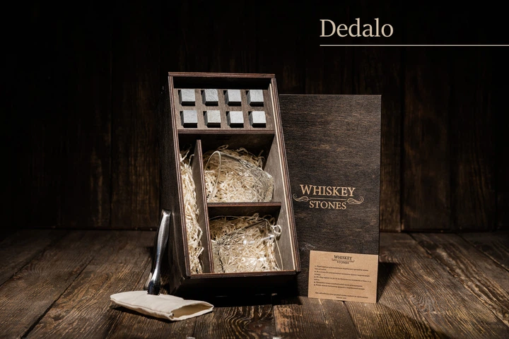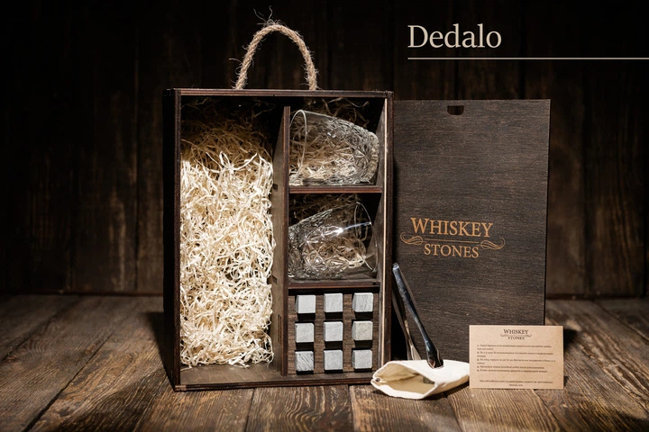Подарочный набор виски с камнями для виски + 9 камней для виски + 2 стакана ROCCO DEDALO (260 мл) + место для виски + щипцы