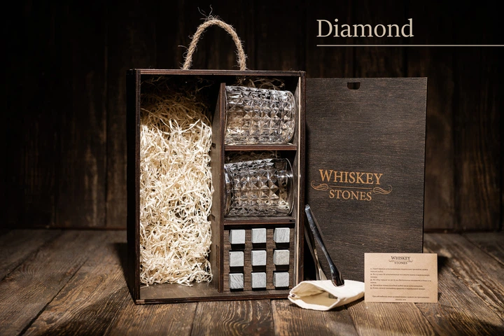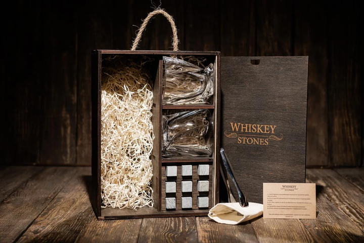 Подарочный набор камней для виски в деревянном пенале. 8 камней для виски + 2 бокала Bohemia Quadro