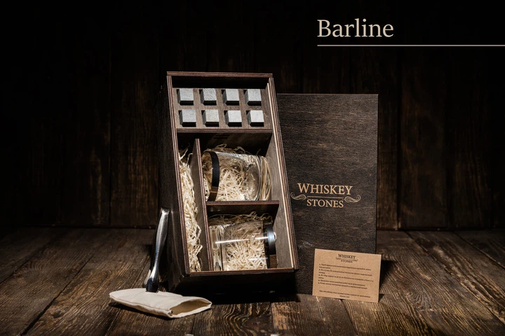 Подарочный набор виски с камнями для виски + 8 камней для виски + 2 стакана BARLINE QUADRO (280 мл) + щипцы + мешочек для хр