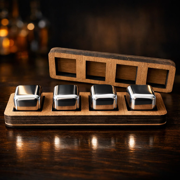 Подарунковий набір для віскі у вишуканій дерев'яній коробці з витонченими келихами кубиками з нержавіючої сталі Moltis (1025