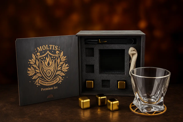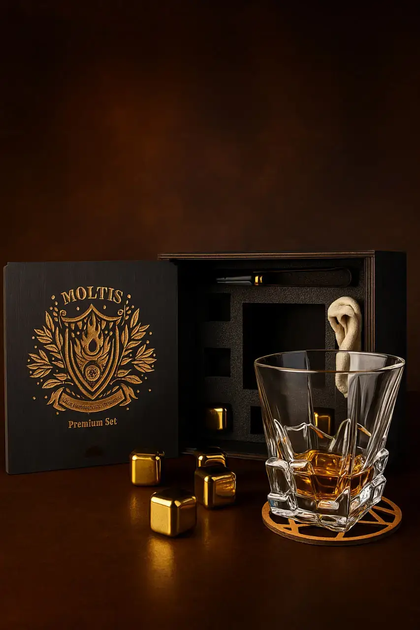 Подарунковий набір для віскі Moltis Premium Set Quadro — келих, щипці, мішечок, підставка та 5 кубиків, що охолоджують (MR-1