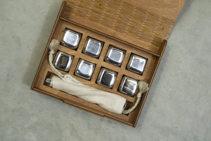 Подарунковий набір Moltis Relax – 4 срібні металеві кубики для напоїв у дерев'яній коробці (WS-10701)