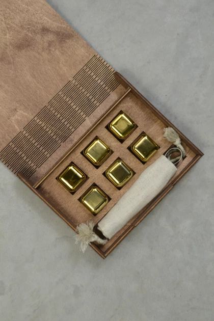 Подарунковий набір Moltis Relax – 4 золоті металеві кубики для напоїв у дерев'яній коробці (WS-10702)