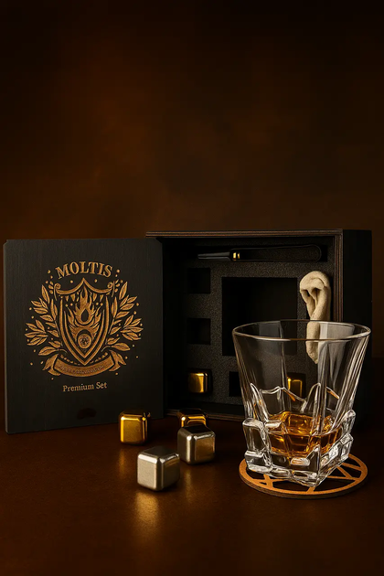 Подарунковий набір для віскі Moltis Premium Saxum — склянка, щипці, мішечок, підставка та 5 кубиків, що охолоджують.