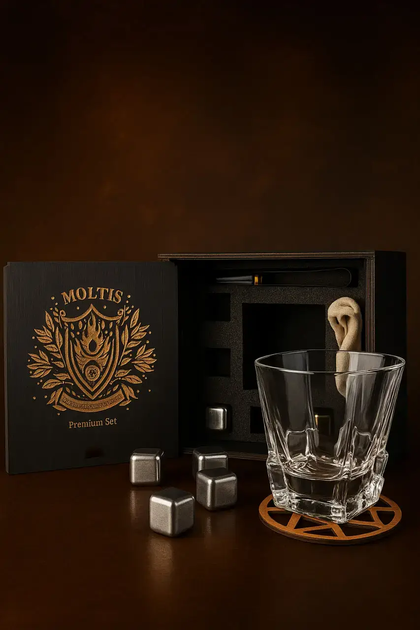 Подарунковий набір для віскі Moltis Premium Saxum — келих, щипці, мішечок, підставка та 5 охолоджувальних кубиків (MR-1022)