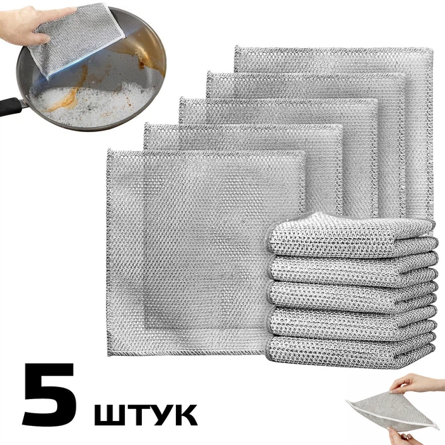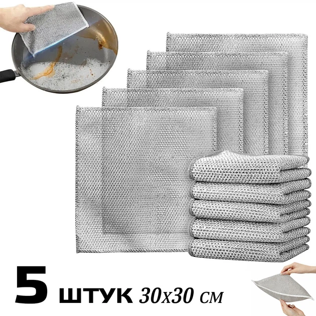 Двошарові багаторазові металеві серветки з абразивною поверхнею для посуду, скла та меблів 30х30 см (5 штук)