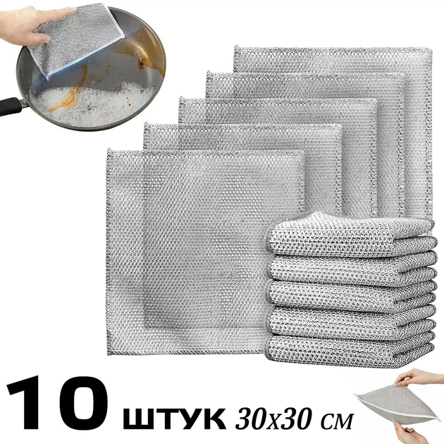 Двошарові багаторазові металеві серветки з абразивною поверхнею для посуду, скла та меблів 30х30 см (10 штук)
