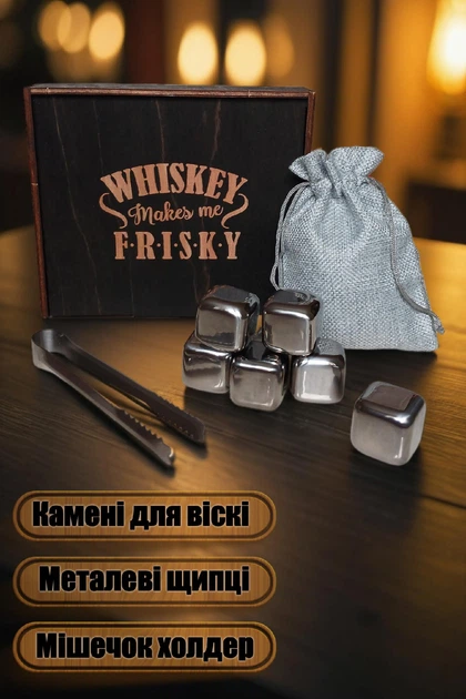 Камні для віскі 6шт Дерев'яній коробці з щипцями та мішечком Металеві кубики для віскі Камені металеві для охолодження напої