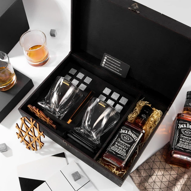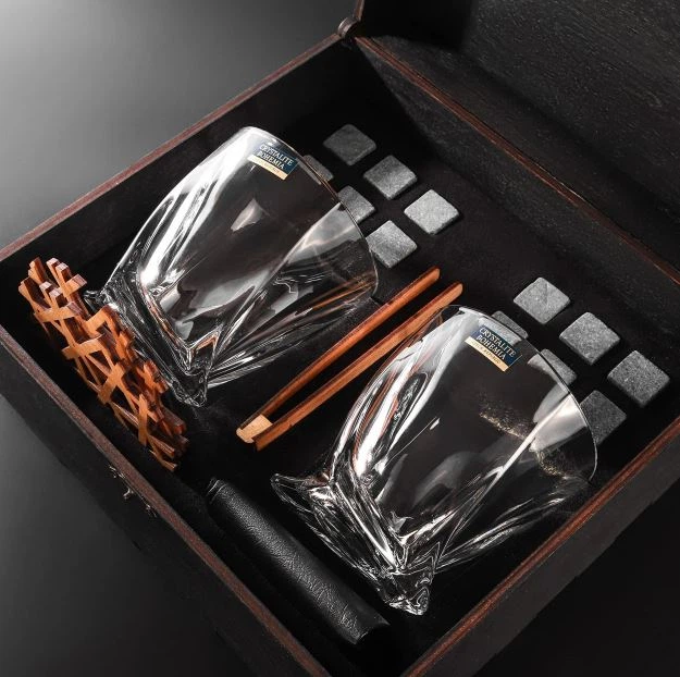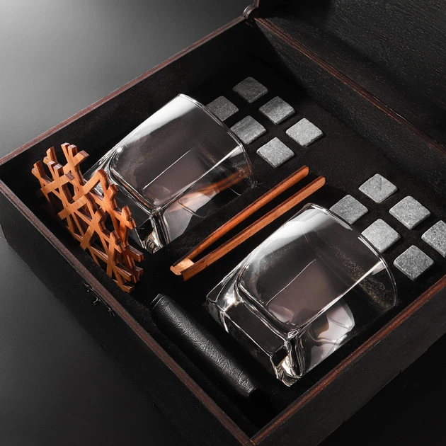 Камни для охлаждения виски Темная коробка + 2 шт Бокала Bohemia Quadro 340 мл + мешочек + щипцы + подставка + 12 камней