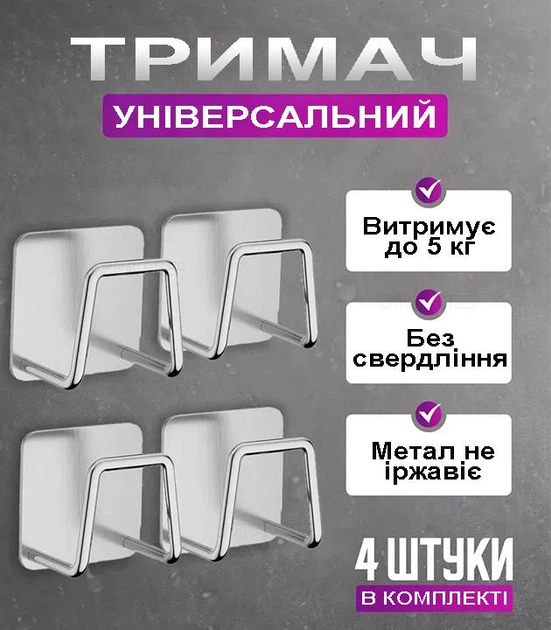 Тримач для кухонної губки та дрібниць з нержавіючої сталі, НАБІР 4 шт, Універсальний металевий гачок для кухні, Клейкий монт