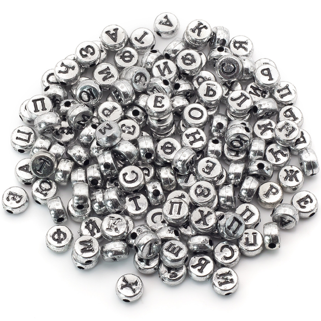 Намистини у формі англійський алфавіт пластикові чорні літери 7х4 мм 25 г +- 190 шт Сріблястий (БП0704н00)