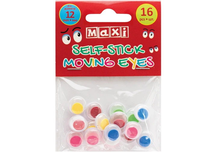 Рухливі оченята для декорування на клейкій основі кольорові, діаметр 12 мм, 16 шт.
