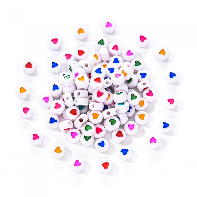 Намистини Акрилові з Серцем, Плоскі Круглі, Мікс, 7х7х3.5мм, Отвір 1.8мм, 100шт/упаковка