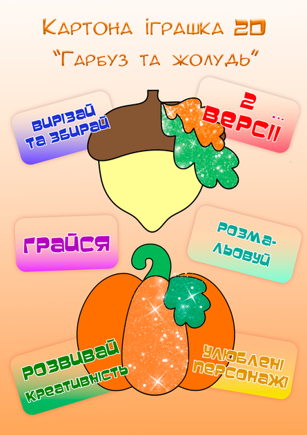 Набір для творчості та рукоділля «Гарбуз та жолудь» 2D картонна осіння аплікація, поробка та розмальовка