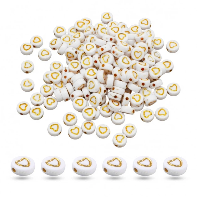 Намистини Акрилові Білі із Золотим Серцем, Плоскі Круглі, 7х4мм, Отвір 1.5мм, 170шт/25г