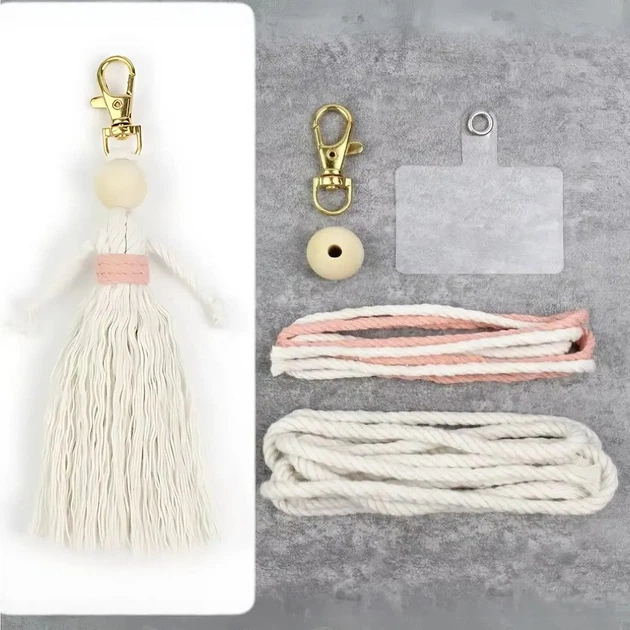 Набір макраме для рукоділля та плетіння брелока "Лялечка" для ключів та аксесуарів білий з персиковим 5088594