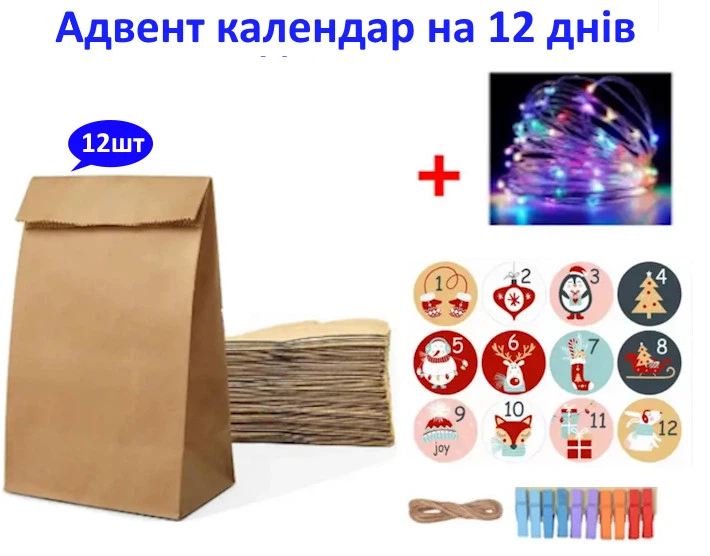 Адвент Календар Різдв'яний на 12 днів. Пакети паперові, наліпки, прищіпки + гірлянда -76572