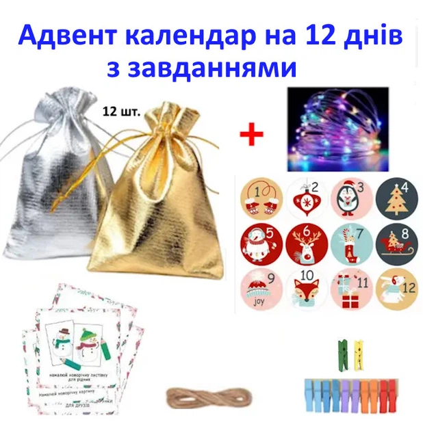 Адвент календар на 12 днів (Мішечки, наклейки, прищіпки, завдання.)--76571-12K