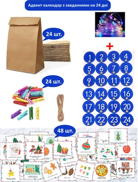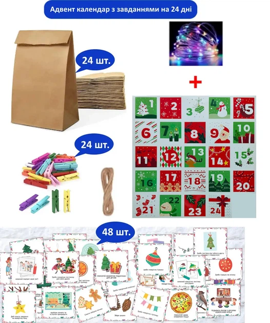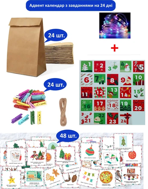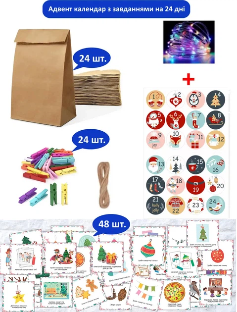 Адвент Календар Різдв'яний на 24 дні. Пакети паперові, наліпки, прищіпки, завдання + гірлянда.-76548K