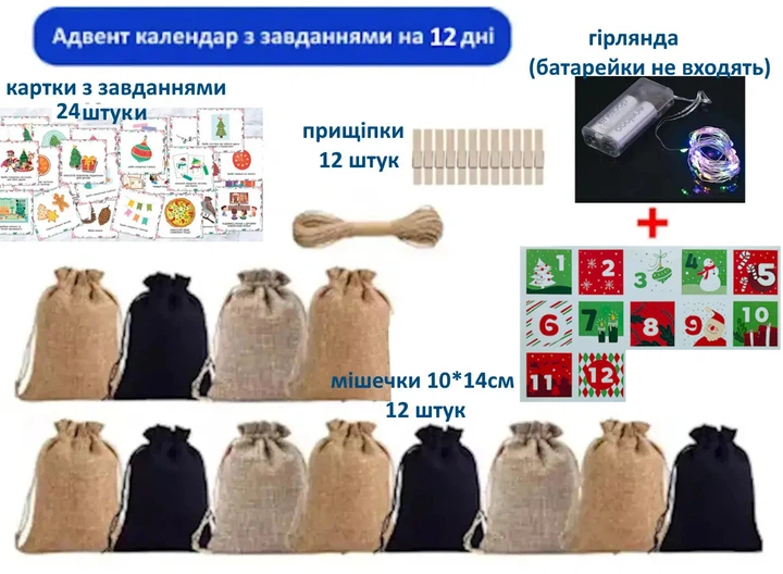 Адвент календар на 12 днів (мішечки, наліпки, прищіпки, завдання).---76569K