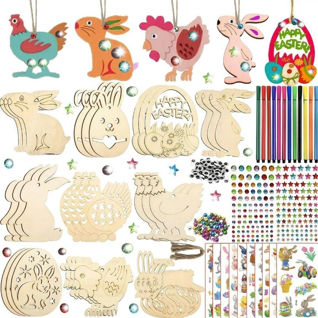 Пасхальний дерев’яний набір 30 шт фігурок в Пасхальній тематиці, наклейок та олівців для фарбування та творчості