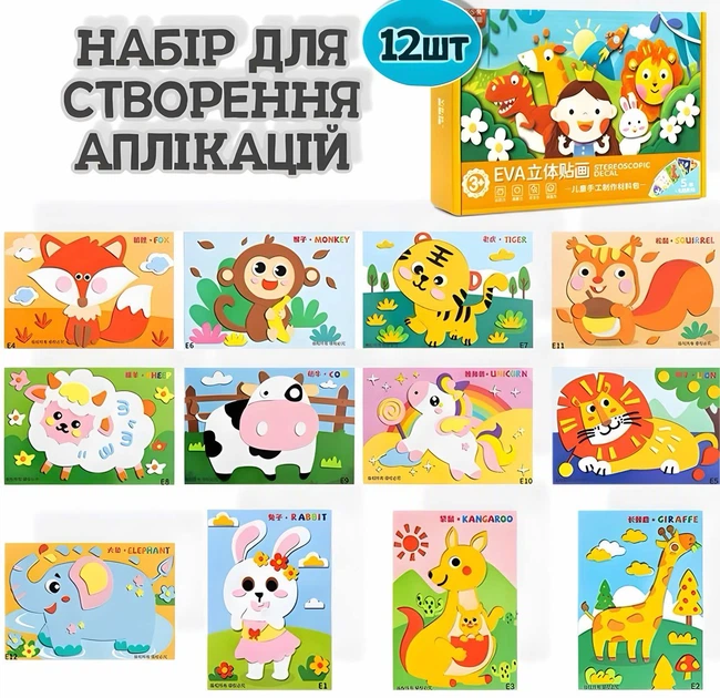 Дитячий художній набір 3D наклейок для творчості в коробці пазл-розмальовка аплікації 12шт (AN)34457