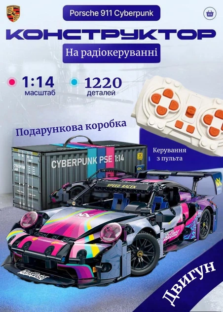 Конструктор Porsche 911 Cyberpunk на радіоуправлінні, 1220 деталей, у подарунковій коробці