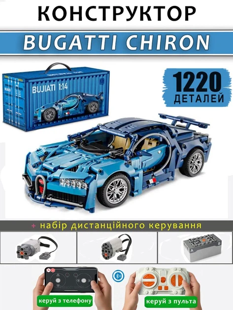 Конструктор машинка технік Bugatti chiron на 1220 деталей в масштабі авто 1:14 Бугатті синій на пульті керування з мотором т