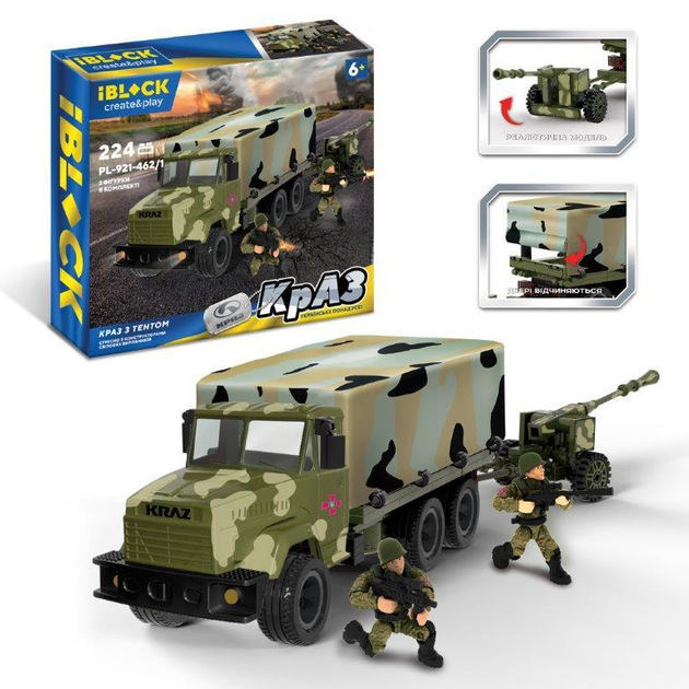 Конструктор пластиковий Краз із тентом Гаубиця гармата 224 деталей iBlock 37,5*26*6 см PL-921-4621