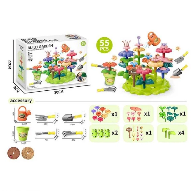 Конструктор A 42-1 “Квітковий сад”, набір садівника, 55 елементів, граблі, лопата, вила, лійка, вазон, квіти, в коробці