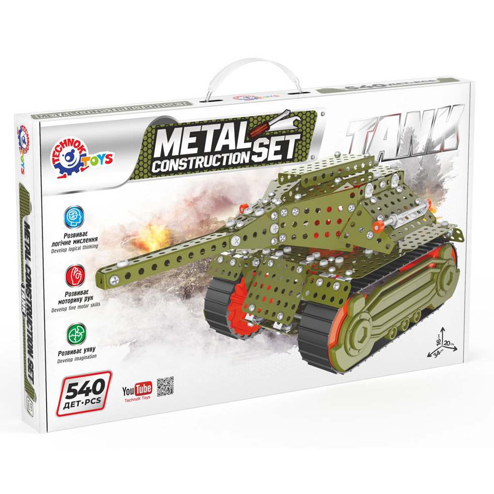 Конструктор Technok Танк — ідеальний подарунок для дітей, які люблять військову тематику та конструювання. Робота над конструктором розвиває логічне мислення та моторику рук, вміння роботи з технічною документацією, а також сприяє розвитку уяви. Діти зможуть відчути себе справжніми інженерами, складаючи складну модель з набору деталей. В конструкторі 540 деталей. Башта танка