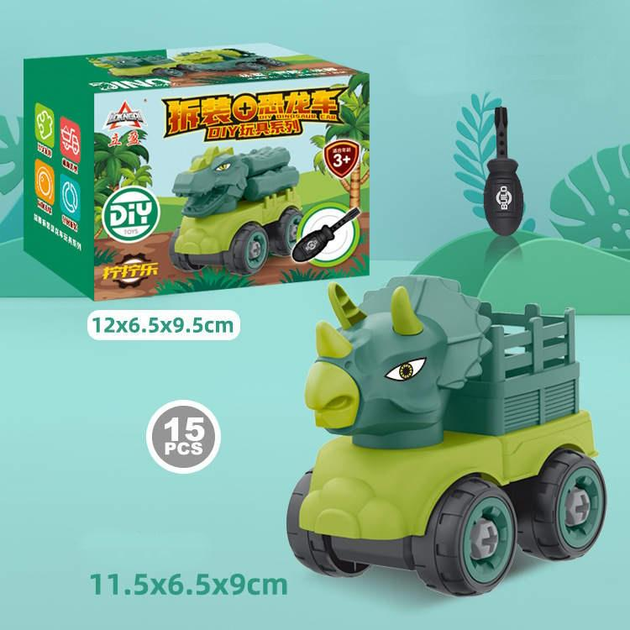 Конструктор пластиковий розвиваючий на шурупах "Динозавр-машинка" - трицератроп пікап
