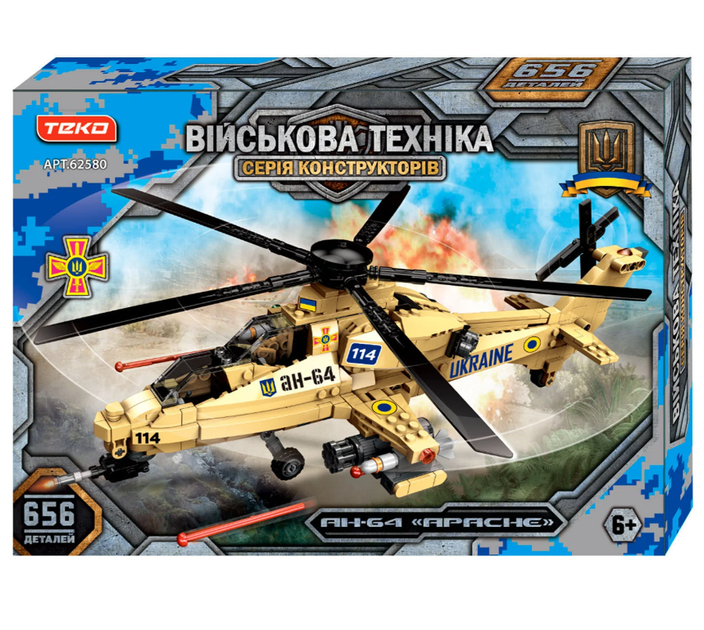 Конструктор Teko Військова техніка 656 деталей, Вертоліт AH-64 “Apache” з руховими елементами