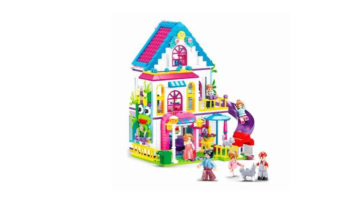 Конструктор SLUBAN M38-B0974 — Двоповерховий будиночок з меблями, гіркою та фігурками, 730 деталей, різнокольоровий