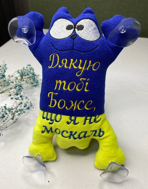 М'яка іграшка кіт Саймона на присосках з написом Дякую тобі Боже, що я не москаль"25 см синій жовтий