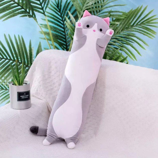 Плюшева м’яка комфортна подушка-обіймашка Кіт Батон для сну та відпочинку 70 см Сірий з Білим