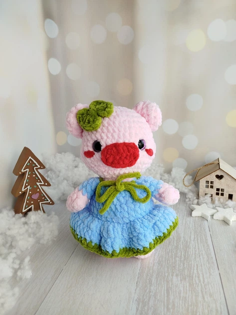В’язана м’яка плюшева іграшка амігурумі свинка леді “Хрюша Сьюзі”, колір рожевий, зелений, блакитний, 24 см, ручна робота