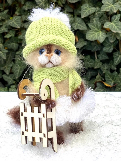 Сіамський котик у теплій шапочці та шарфику, із саночками, в'язана іграшка, Совушка