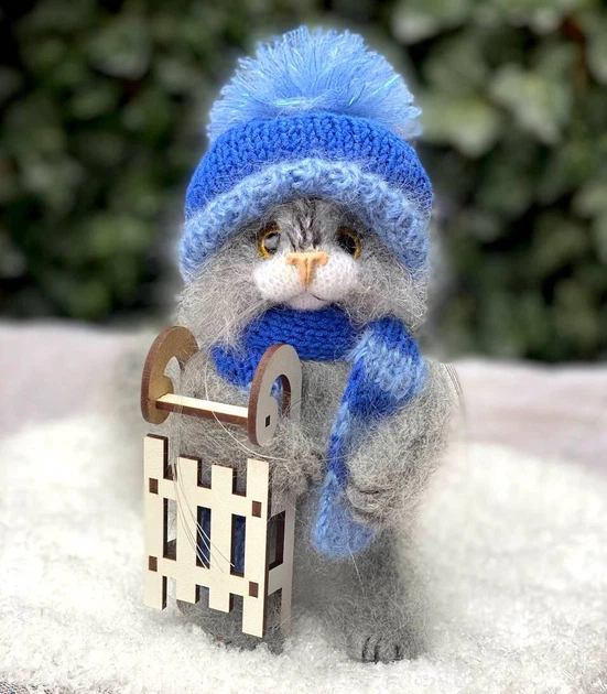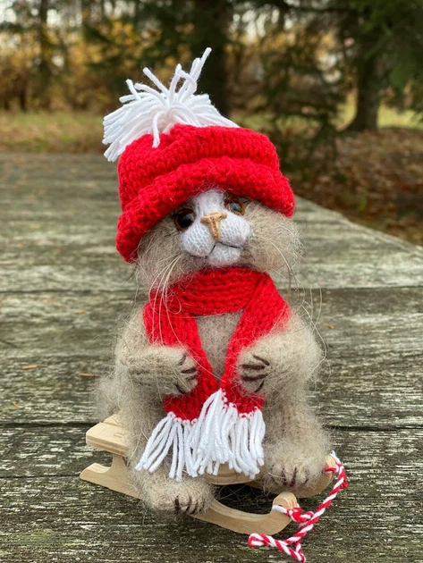 Пухнастий сірий котик із санчатами та у зимовій шапочці з шарфиком, каркасна іграшка, Совушка