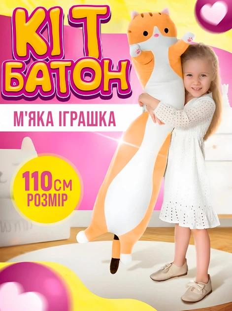 Кіт батон подушка 130 см. М'яка іграшка для сну, рижого кольору