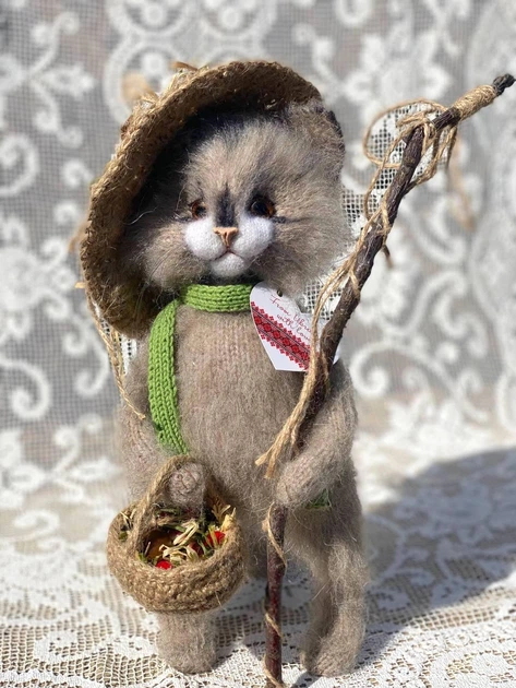 Котик-грибник, пухнаста в'язана іграшка, у якої всі частини тіла згинаються, Совушка