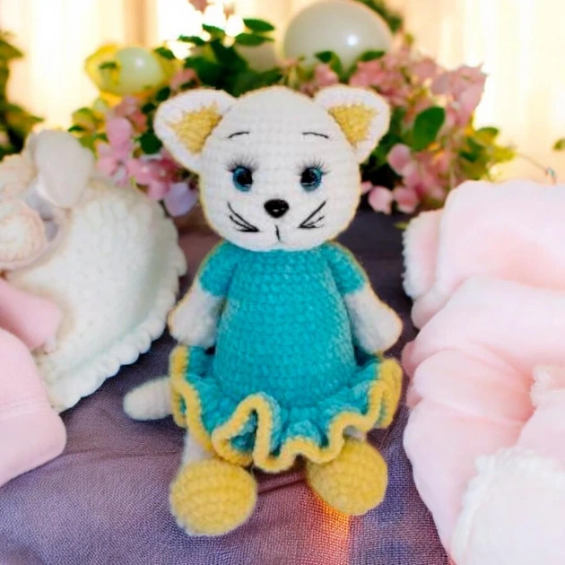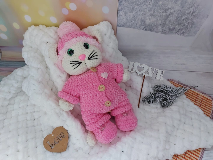 М'яка плюшева іграшка handmade Котик у комбінезоні 32 см в'язаний гачком амігурумі
