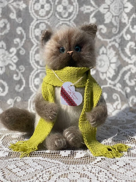 Пухнастий синьокий сіамський котик, в'язана іграшка з гибким тілом, Совушка