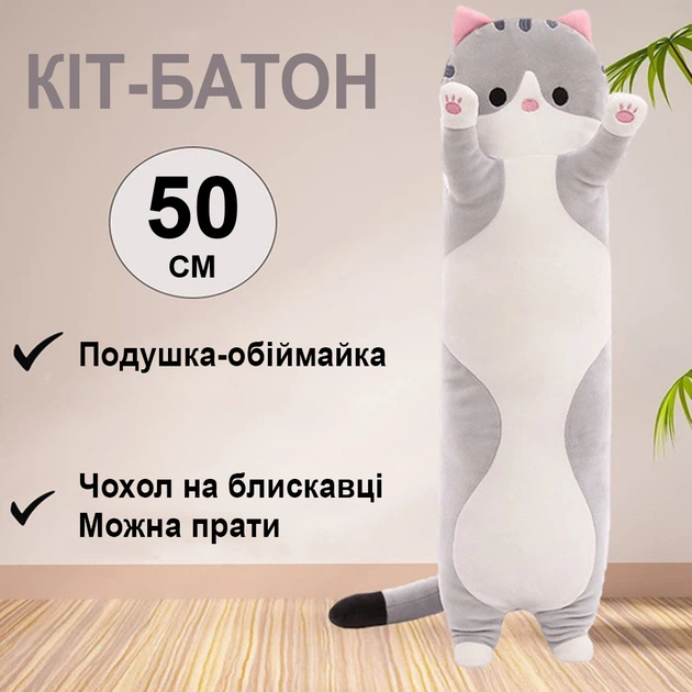 М'яка іграшка-подушка Кіт-Батон 50 см Біло-сірий