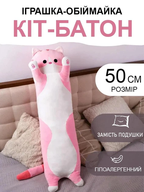 М'яка іграшка-обіймайка подушка "Кіт-Батон" 50 см Біло-рожевий