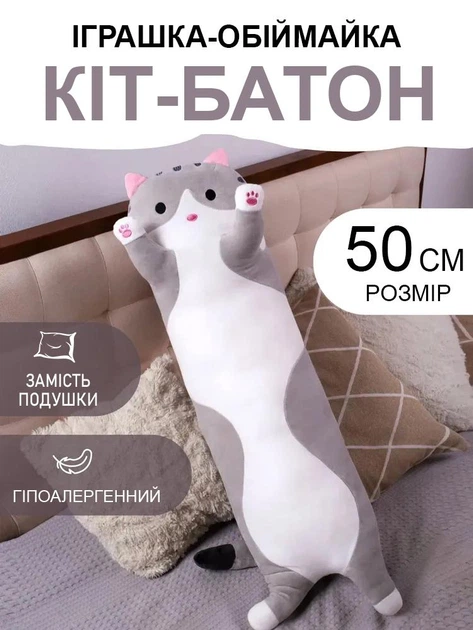 М'яка іграшка-обіймайка подушка "Кіт-Батон" 50 см Біло-сірий