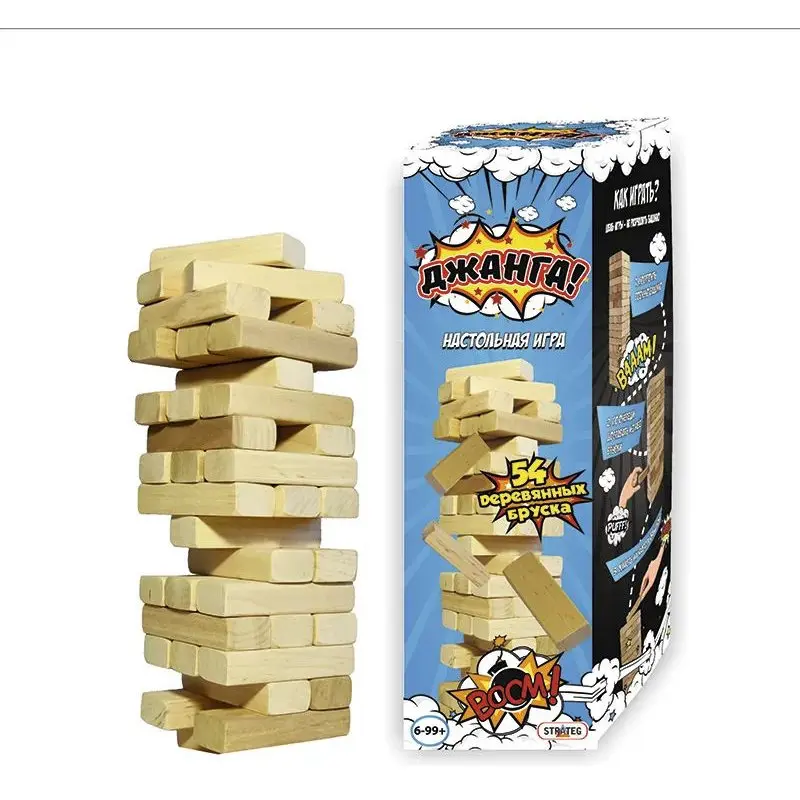 Настільна гра Джанга - це відмінний варіант для дозвілля в сімейному колі, популярний у всьому світі. Суть гри полягає в тому, що необхідно з окремих брусків побудувати вежу, потім кожен гравець по черзі дістає по одному брусочку та укладає їх на вершину по чотири в ряд. Програє той, чия дія буде останньою перед падінням вежі. У цій грі слід обдумувати кожен свій хід, адже один невірний рух - і конструкція зруйнується! Граючи діти будуть розвивати логічне мислення, координацію, вміння прораховувати ризики та акуратність. Таке проведення часу може стати відмінною сімейною традицією, яка сподобається і дітям, і дорослим.