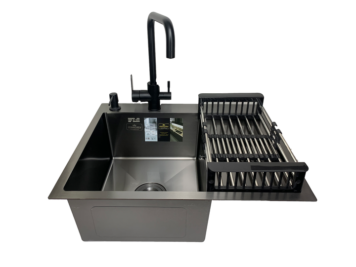 Мийка кухонна Kroner 63*50 (см), чаша ліворуч , у чорному Pvd змішувач + кошик + дозатор