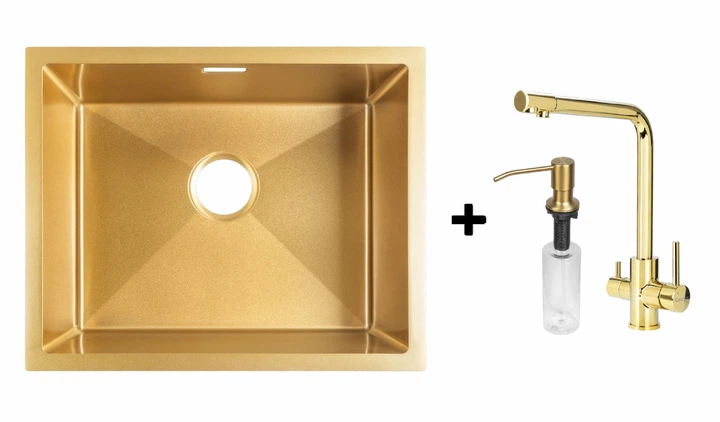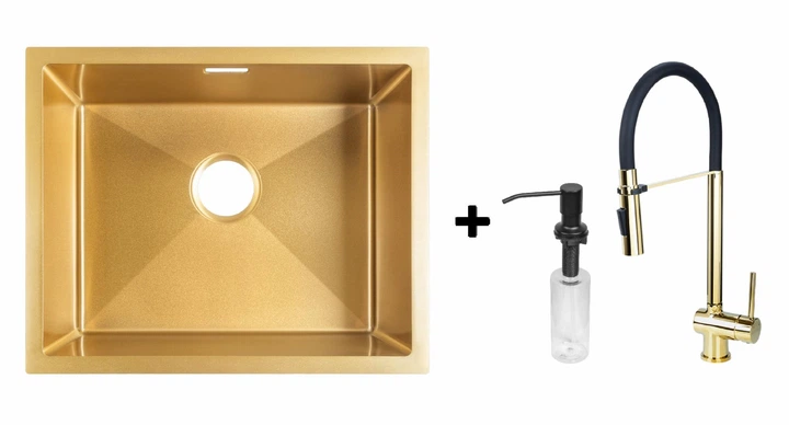 Комплект Gunter&Hauer: Кухонна мийка Ruwer 5522 Gold + Змішувач PERLE Gold + Дозатор SOAP DISPENSER Gold