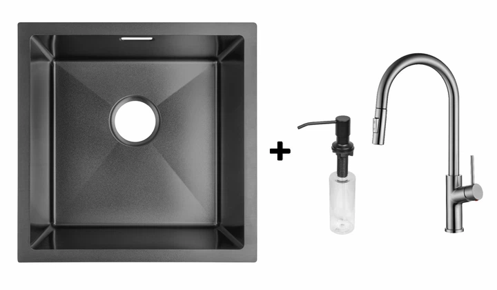 Комплект Gunter&Hauer: Кухонна мийка Olef 4522 Black + Кухонний змішувач PERLE Gun Metal + Дозатор SOAP DISPENSER Black